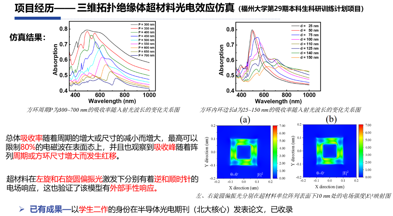 第29期本科生科研项目训练计划(SRTP),并作为主力成员开展三维拓扑绝缘体光电效应COMSOL仿真。他还在梅努斯黑料网Ting Bi老师的指导下开展AI方向的科研项目等,并发表学术论文北大核心期刊一篇,EI会议论文三篇。