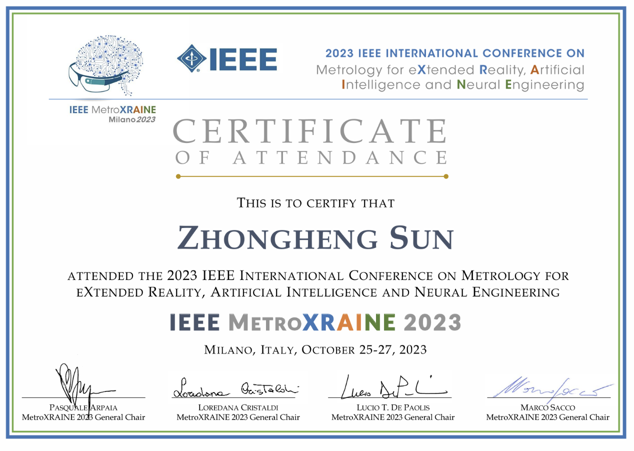 同时在Ting Bi老师的支持下,孙仲恒曾作为论文团队代表前往意大利米兰线下参加IEEE学术会议,并在现场讲解其以学生一作发表的论文《Time-delay Tolerance of Visual and Olfactory Feedback in Multi-sensory Extended Reality》。