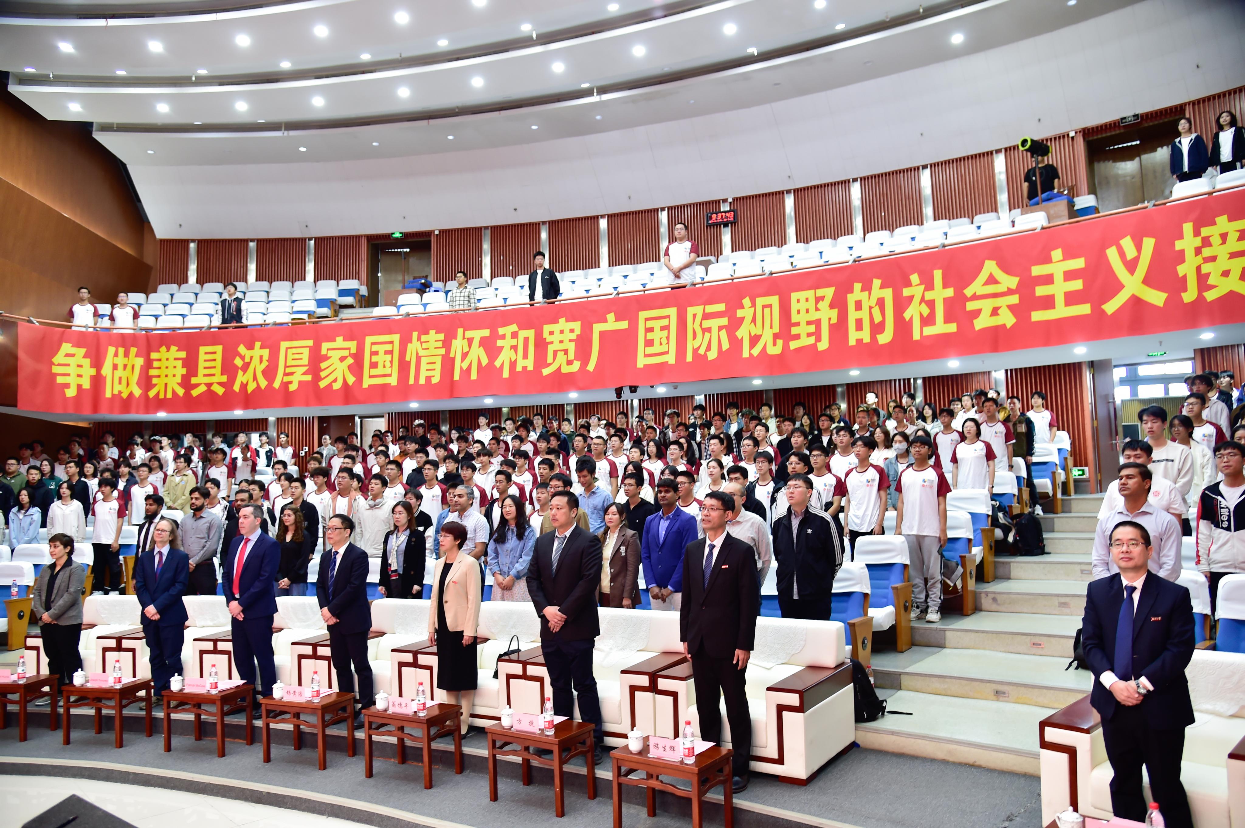 典礼伊始,全场肃立,齐声奏唱国歌。